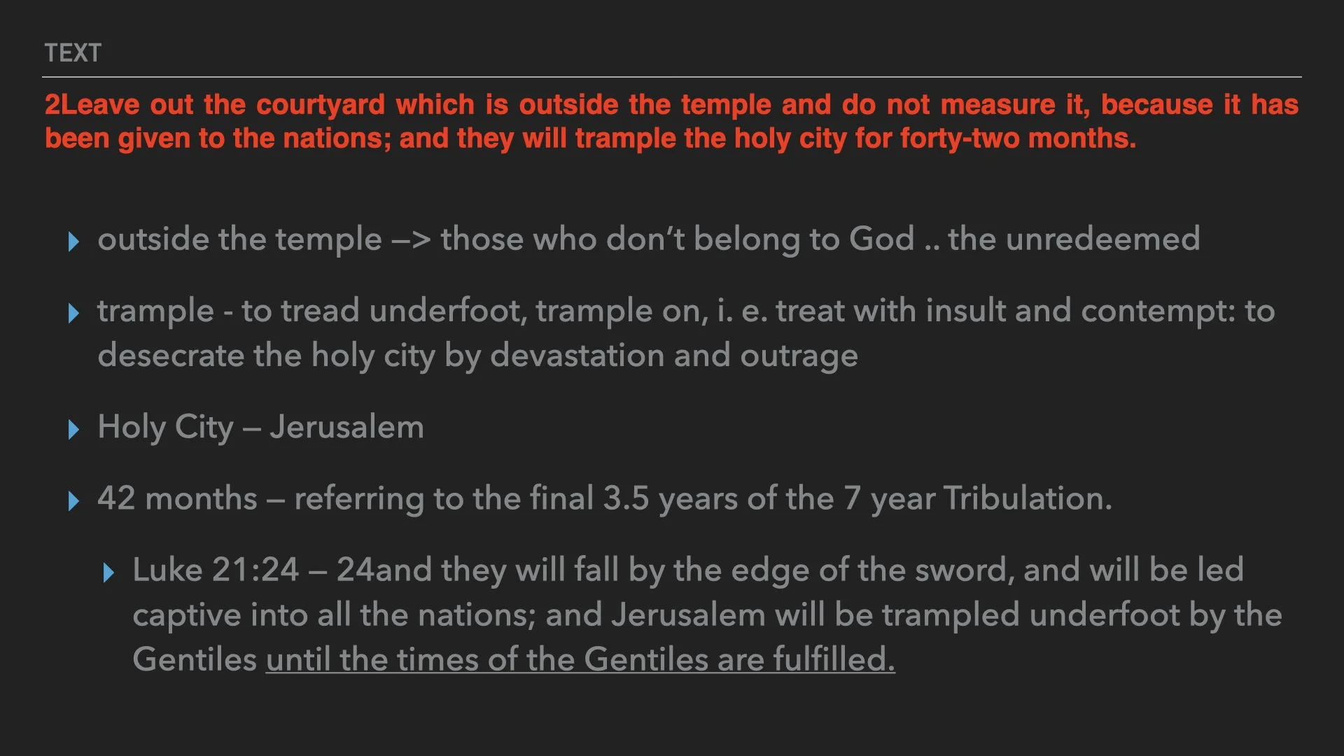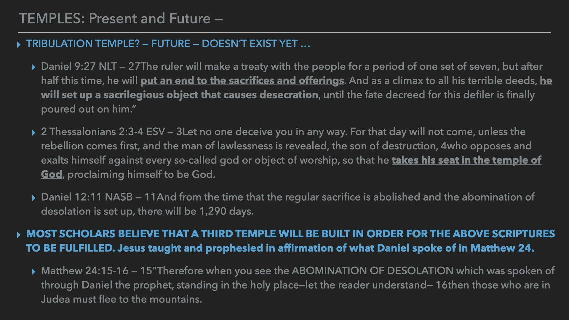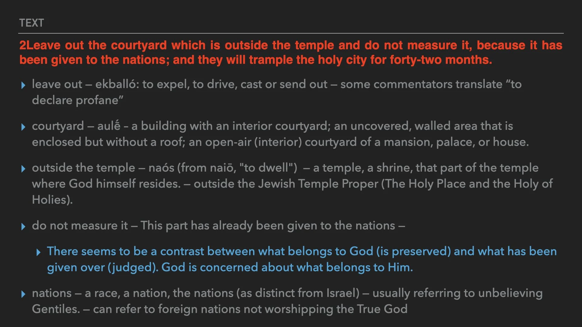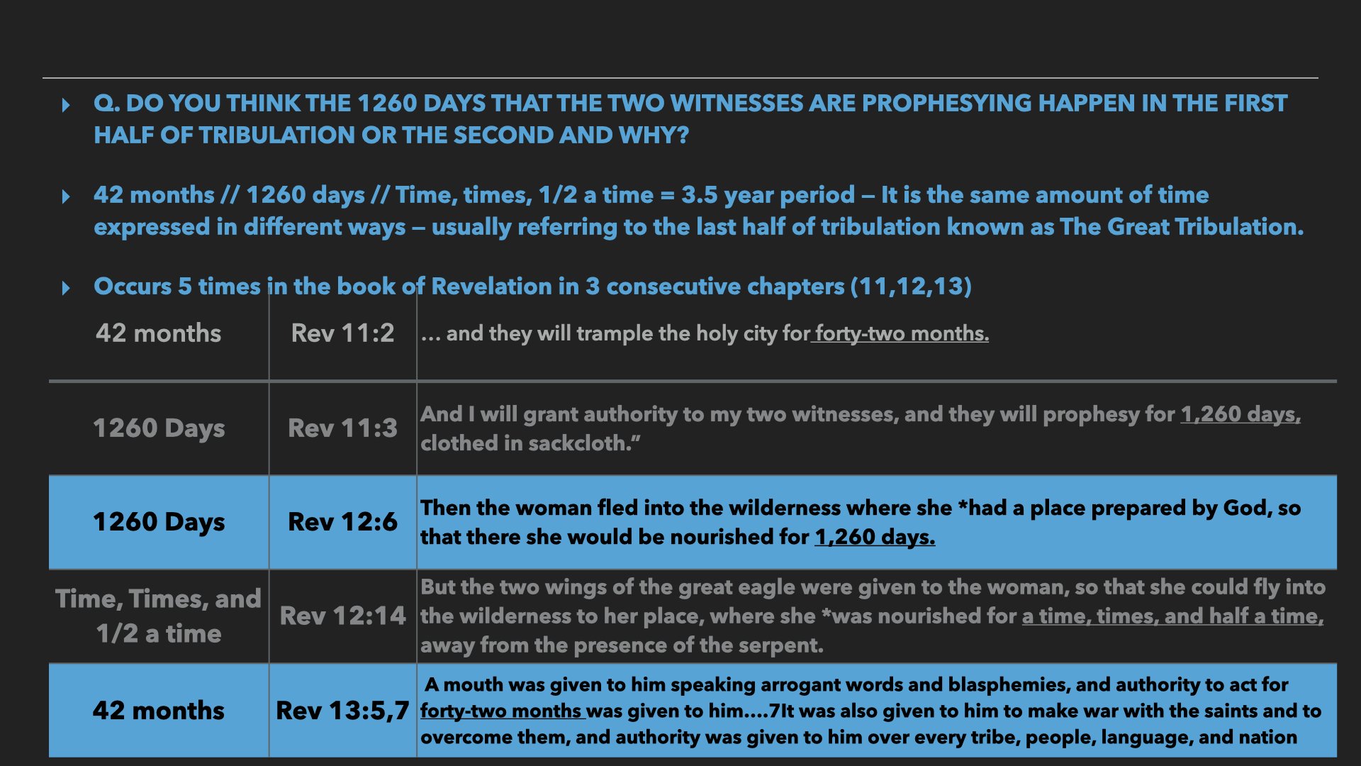 In chapters 11-13, we will learn more of that final 3.5 year period, and the events surrounding it. We know this because you will see phrases like, “42 months,” “a time, times, and half a time,” and “1260 days.” When you do the math, you realize that these phrases are just different ways to say “3.5 years.” In 4 out of the 5 times these phrases are used, it is clear that it is referring to that final 3.5 year period. In chapter 11, however, many debate on whether the Two Witnesses will minister during the first 3.5 years or the second half. I don’t know that we should get hung up on that detail, but for what it’s worth, I’m leaning toward the first half of the 7 Year Tribulation.