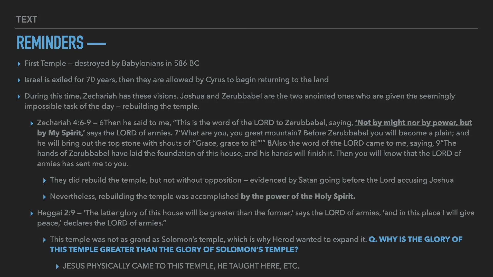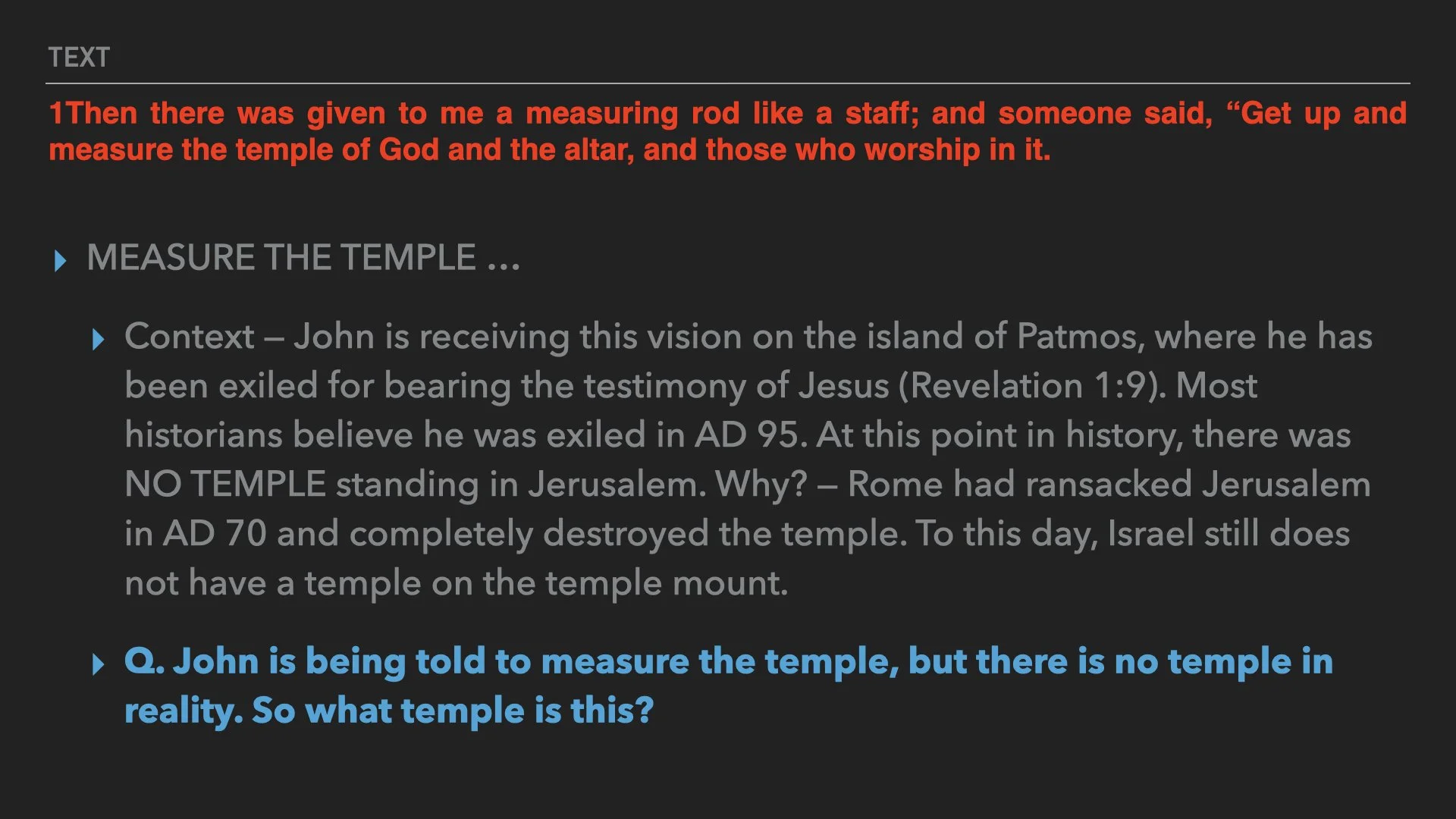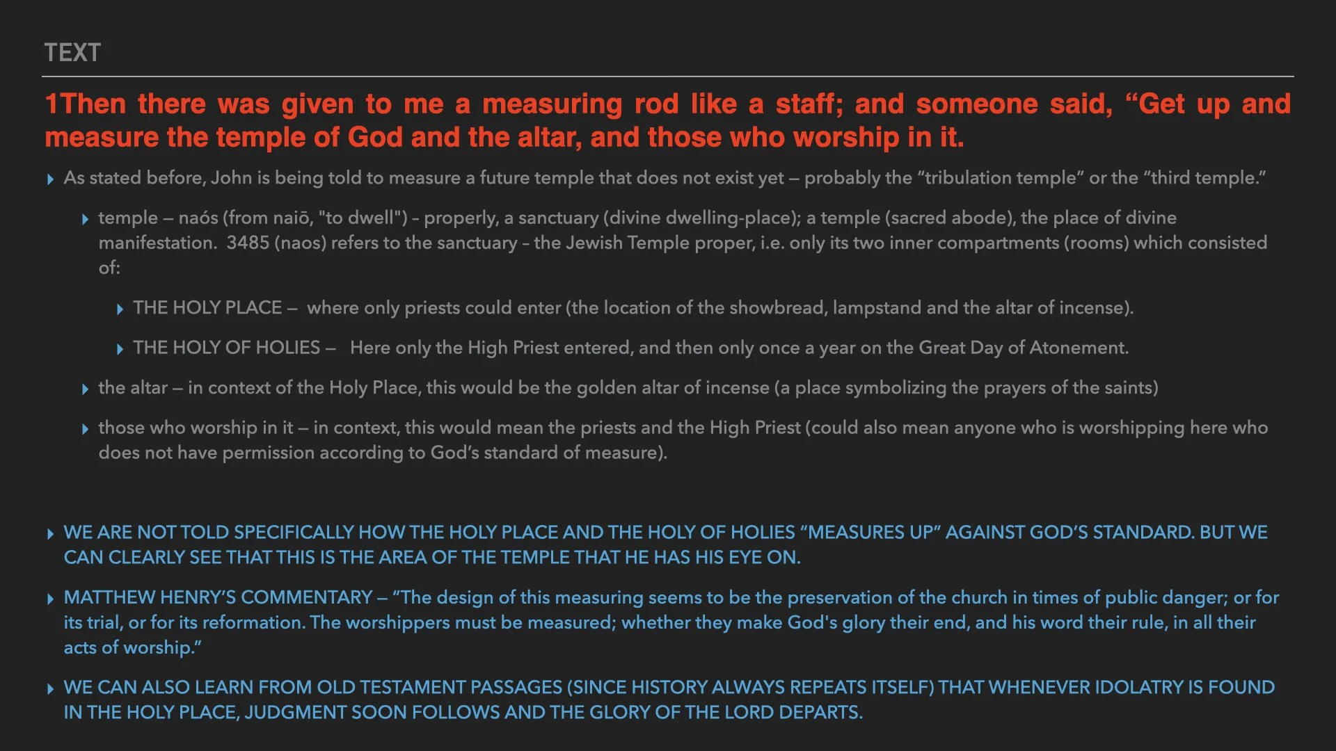 This week, we look at the first four verses in Revelation 11. We will look back in Israel’s history to understand what “measuring the temple” is all about, and we will also take some time to think about who these witnesses might be. Of course, this will be nothing more than a fun mental exercise because the Scripture does not tell us their names. Understand that this is pure speculation, but in doing so, we will look back through several Scriptures to see if we can connect any dots.