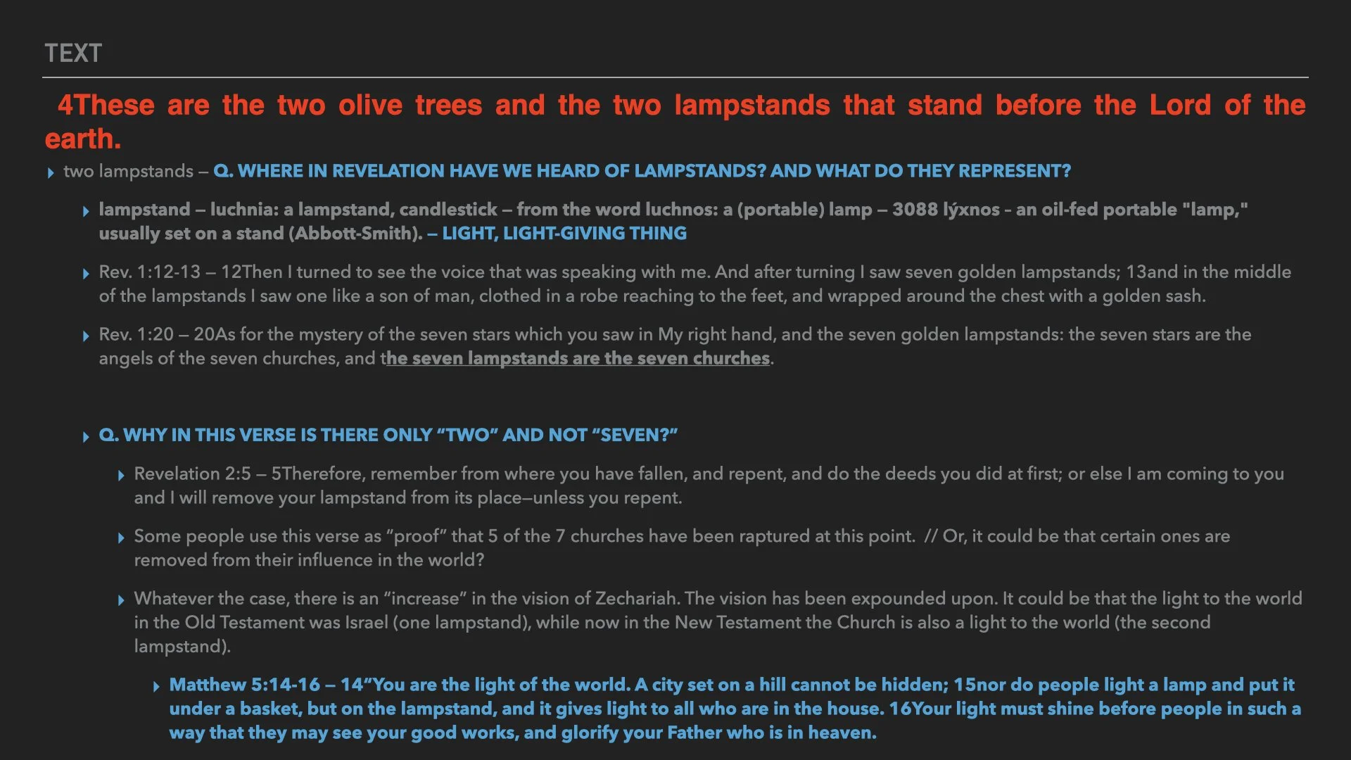 We also discussed how this vision of John’s in chapter 10 is very similar to Daniel’s vision in Daniel 12. We talked about how Daniel received part 1 of this vision and John receives part 2. In Daniel, we learn that the vision concerns “a time, times, and half a time” (12:7), which we know is that final 3.5 year period of The Great Tribulation. And then in Revelation, John hears, “there will be no more delay!” (10:6) — While Daniel was told to seal up this prophecy, John was told to eat the scroll (digest the contents) and to prophesy. The time for explanation to that final 3.5 year period begins to unfold, and John is charged with the responsibility to deliver this prophecy.